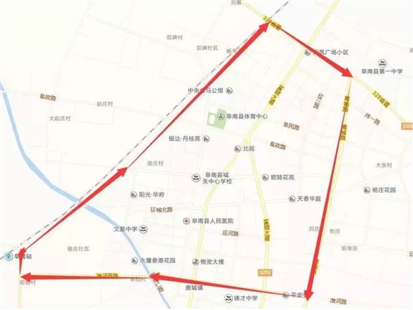 阜阳市禁止燃放烟花爆竹区域:“人民西路—南京路—古泉路—颍东路—S305 阜蚌路—东环路—纬三路—经六路—G105—经八路—经二路—润河路—南京路—机场路—学苑路南延线(一道河路至机场路)—学苑路—人民西路。”所合围区域。
