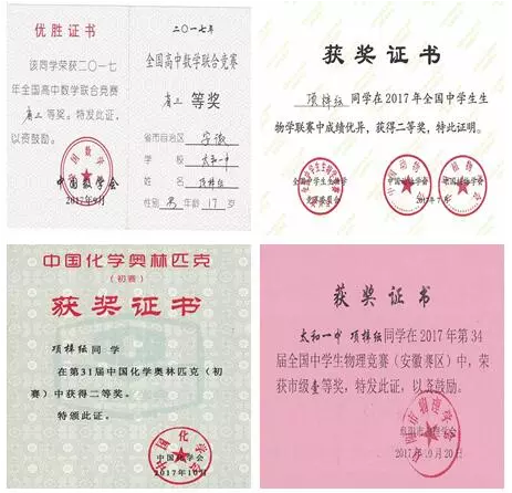 在高中阶段,项梓纭还获得了全国中学生生物学联赛二等奖、第31届中国化学奥林匹克赛二等奖、全国高中数学联合竞赛省三等奖、第34届全国中学生物理竞赛(安徽赛区)市级一等奖。