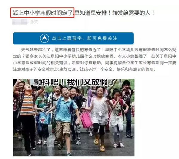 今天上午小编看到一篇文章关于颍上中小学寒假时间定了在文章内容中更是公布了阜阳2019年中小学寒假放假时间安排文中写道:阜阳2019年中小学寒假放假时间从2019年1月21日(星期一)开始,2019年2