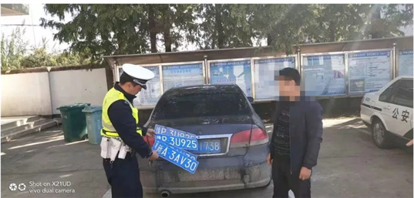 2018年11月9日10时许,阜阳市交警二大队宁老庄交警中队民警通过缉查布控系统预警发现,有一辆涉嫌报废的轿车正在路上行驶。民警迅速上路布控,在105国道901公里颍泉段将嫌疑车辆拦停。民警现场检查发