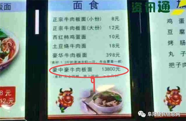 咱吃货们的美食又出稀奇事儿!生产传承于我们阜阳太和的一碗板面竟然叫价13800元,虽说是牛肉板面,只是这价格也太不靠谱了点吧!13800这得买多少斤牛肉啊?这事