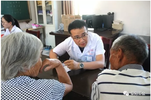 7月18日一大早,阜阳市总工会、阜阳市人民医院的领导和医疗专家人员一行13人,冒着酷暑来到界首市新马集镇王楼村投入到了紧张有序的义诊工作中,为当地群众提供体检、诊断等免费医疗服务。村民陈洪生爱人患病毒