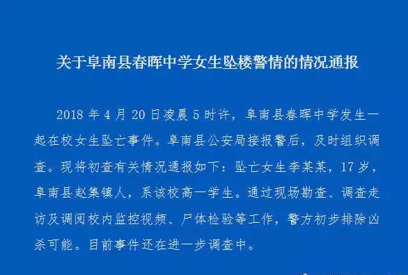 昨日,阜南一学校发生女生坠亡事件,经过调查,原来是。。。来源:阜阳阜南公安在线 关于阜南县春晖中学女生坠楼警情的情况通报2018年4月20日凌晨5时许,阜南县春晖中学发生一起在校女生坠亡事件